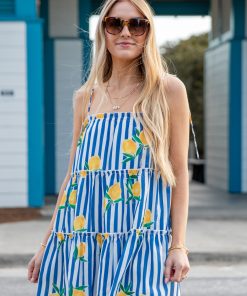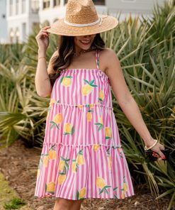 The Citrus Grove Tiered Stripe Mini Dress features fresh stripes paired with a cheerful lemon print for a bright, vacation-ready look. Designed with a flowy babydoll silhouette and adjustable shoulder straps, it creates an easy, relaxed fit that’s both comfortable and feminine. The lightweight woven fabric makes it perfect for warm-weather outings, offering breathable wear from day to night. Pair it with sneakers for a casual daytime look or elevate it with platform sandals for spring break dinners and photos.