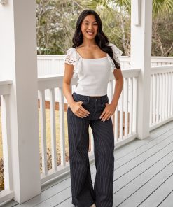 The Collins Pinstripe Wide Leg Jeans offer a polished take on everyday denim-inspired styling. Designed with a flattering high-rise waist and subtle pinstripe detailing, these pants feature a structured fit through the waist with a relaxed wide-leg silhouette for effortless wear. Crafted from comfortable, durable fabric, they’re easy to dress up with blouses or keep casual with fitted tops and knits.