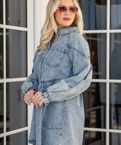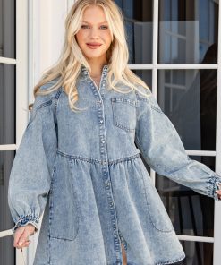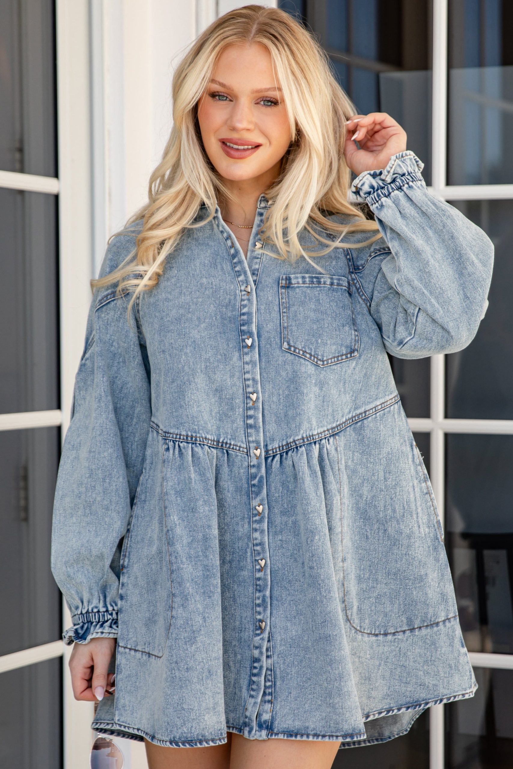 This Loving Detail Denim Mini Dress features a timeless silhouette elevated with charming heart-shaped button details for a subtle, feminine touch. Designed with a structured yet comfortable fit, it includes a flattering cut, button-front closure, and soft denim fabrication that holds its shape while remaining easy to wear. Versatile and effortlessly styled, it pairs perfectly with sandals, boots, or layered knits for a polished everyday look.