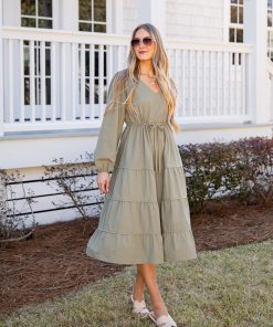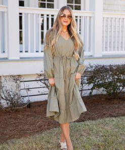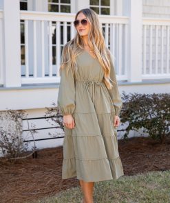 Classic, flattering, and endlessly versatile! This tiered midi dress features a v-neckline, long sleeves, and a soft drape that creates a timeless feminine silhouette. Designed in a calming sage tone, it’s perfect for everyday wear, brunch dates, or styled up for special occasions. Wear it with wedges and some stand-out jewelry for the perfect look! It’s the perfect spring wardrobe staple!